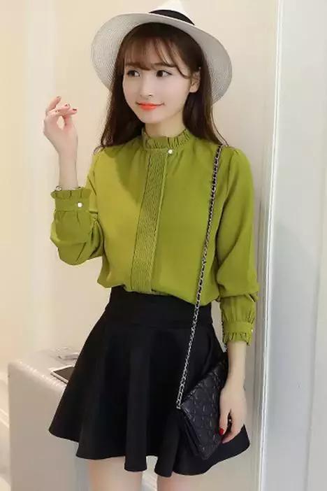春裝韓版修身立領長袖雪紡打底白襯衫女甜美百搭顯瘦雪紡衫襯衣