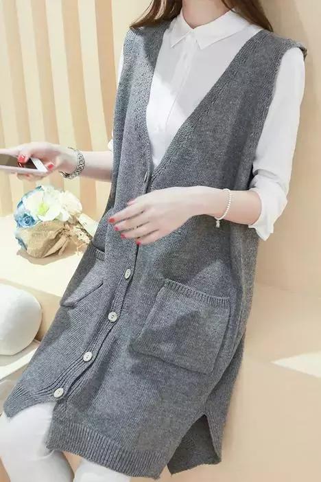韓版時尚大V領單排扣學院風中長款寬松針織衫女開衫背心女毛衣
