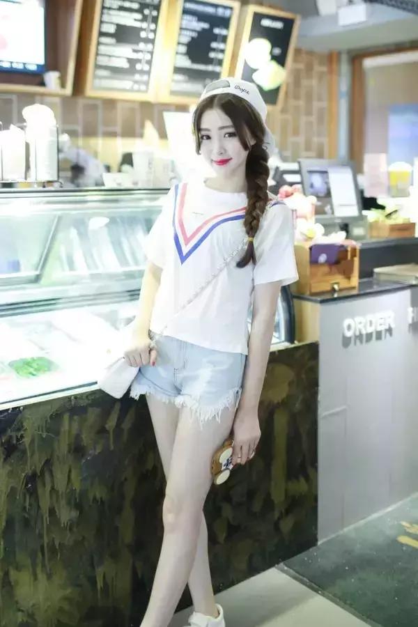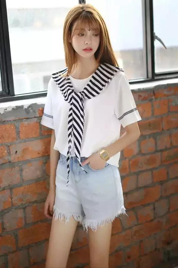 很簡約的一款海軍風(fēng)t恤配上清爽的漸變色藍(lán)牛仔熱褲,加上一條海軍領(lǐng),瞬間減齡五歲!