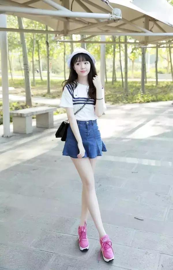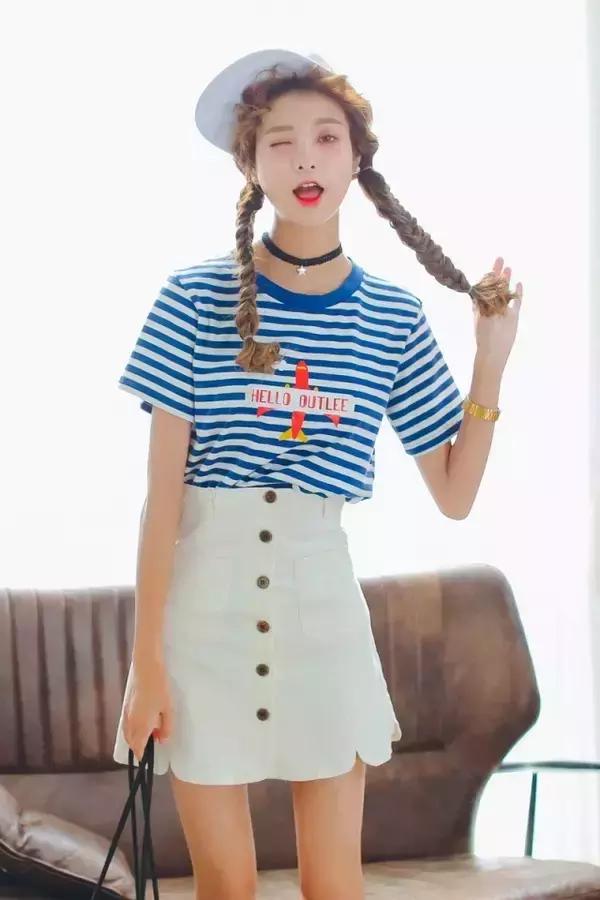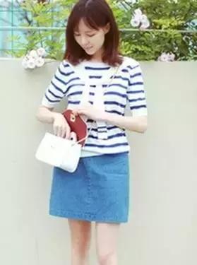 尋常的白t恤在加了三道藍(lán)色的海軍風(fēng)條紋衫時(shí)瞬間變得高大上了!配上荷葉邊的牛仔裙,減齡效果大家看得見!
