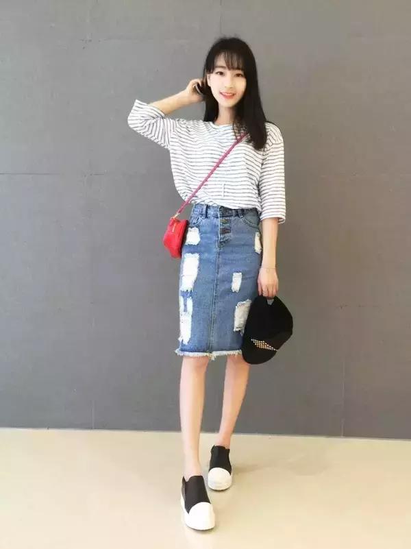 個(gè)子較高的女生不建議穿太短的裙子,第一是怕走光,第二會(huì)有風(fēng)塵味!一條充滿趣味的及膝破洞裙很減齡啊~