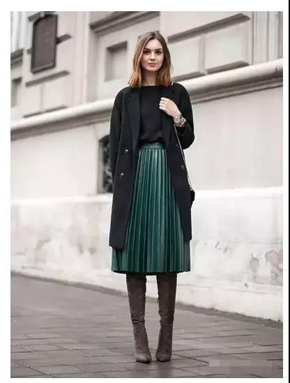 黑色搭配墨綠裙子,高貴知性。