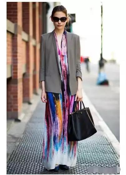 灰色西裝壓住了彩色連衣裙,看起來恰到好處。