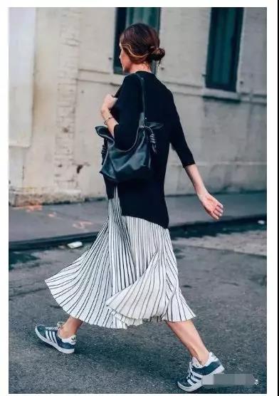 長款黑毛衣搭配條紋裙,瀟灑飄逸。