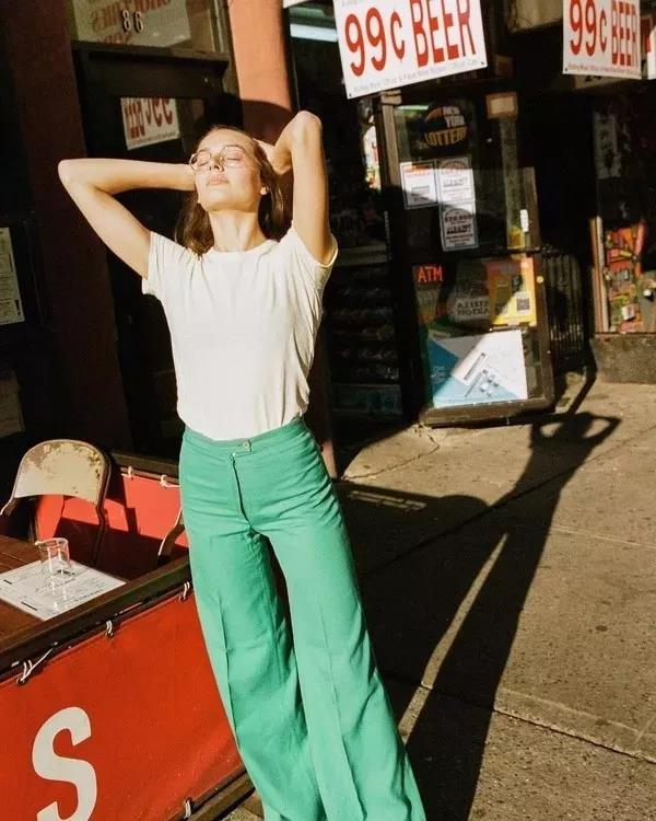 選擇曳地闊腿褲能夠在視覺上延伸你雙腿的長度,達到顯高顯腿長的效果。將T恤衣角打結或者塞進闊腿褲就能夠提高我們的腰線。