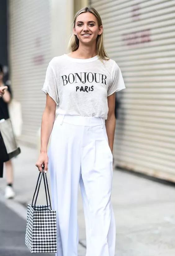 T恤和闊腿褲都是因時髦百搭而深受大眾的喜愛,同樣選擇色彩簡約的款式能夠更加凸顯大氣、高級感。