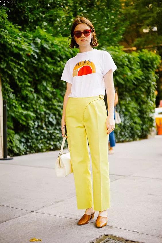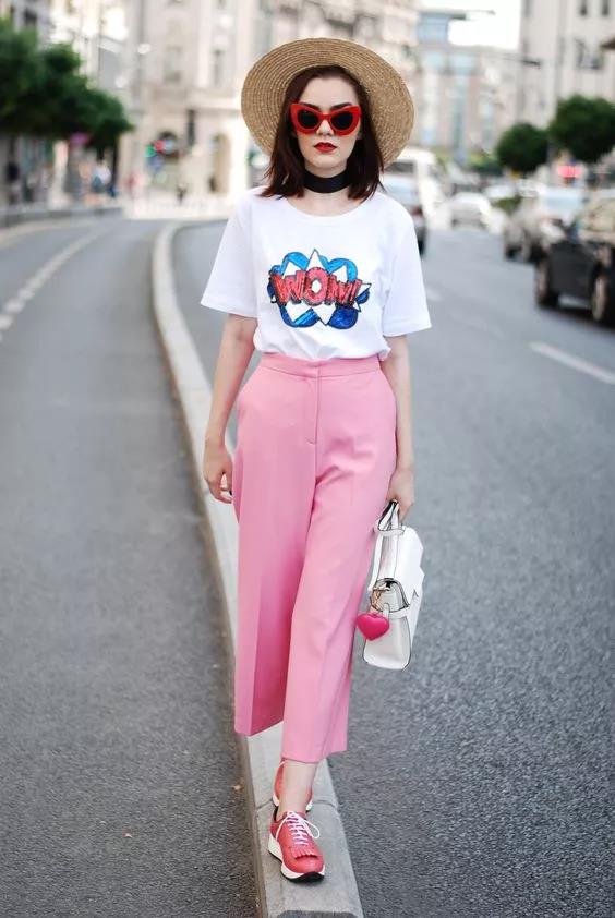 除了黑白灰,還可以選擇馬卡龍色系,搭配圖案T恤個性減齡,時髦好看,還能夠滿足你的少女心。