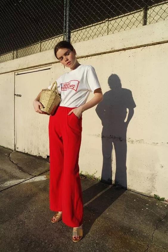 紅色的闊腿褲也超級好看,優雅氣質,還略帶復古韻味。
