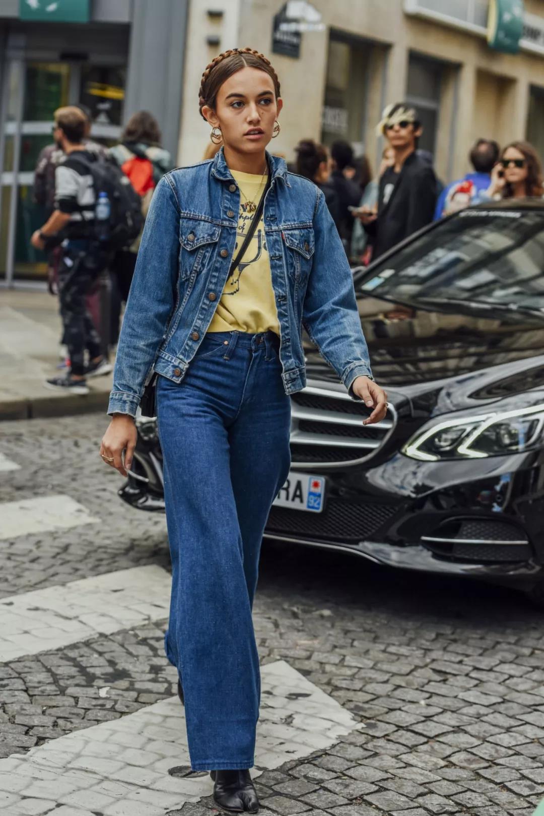 水洗藍的牛仔闊腿褲充滿了復古年代感。