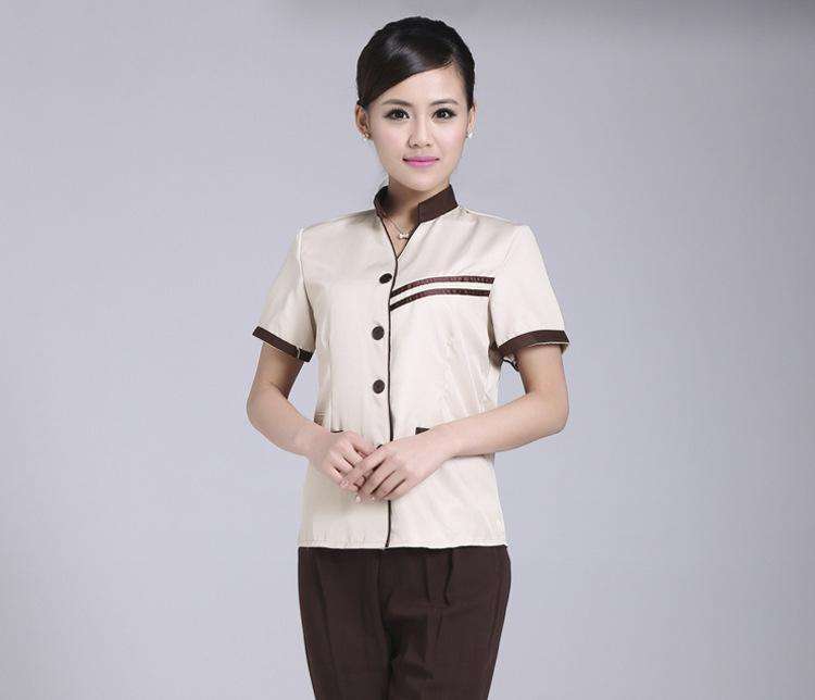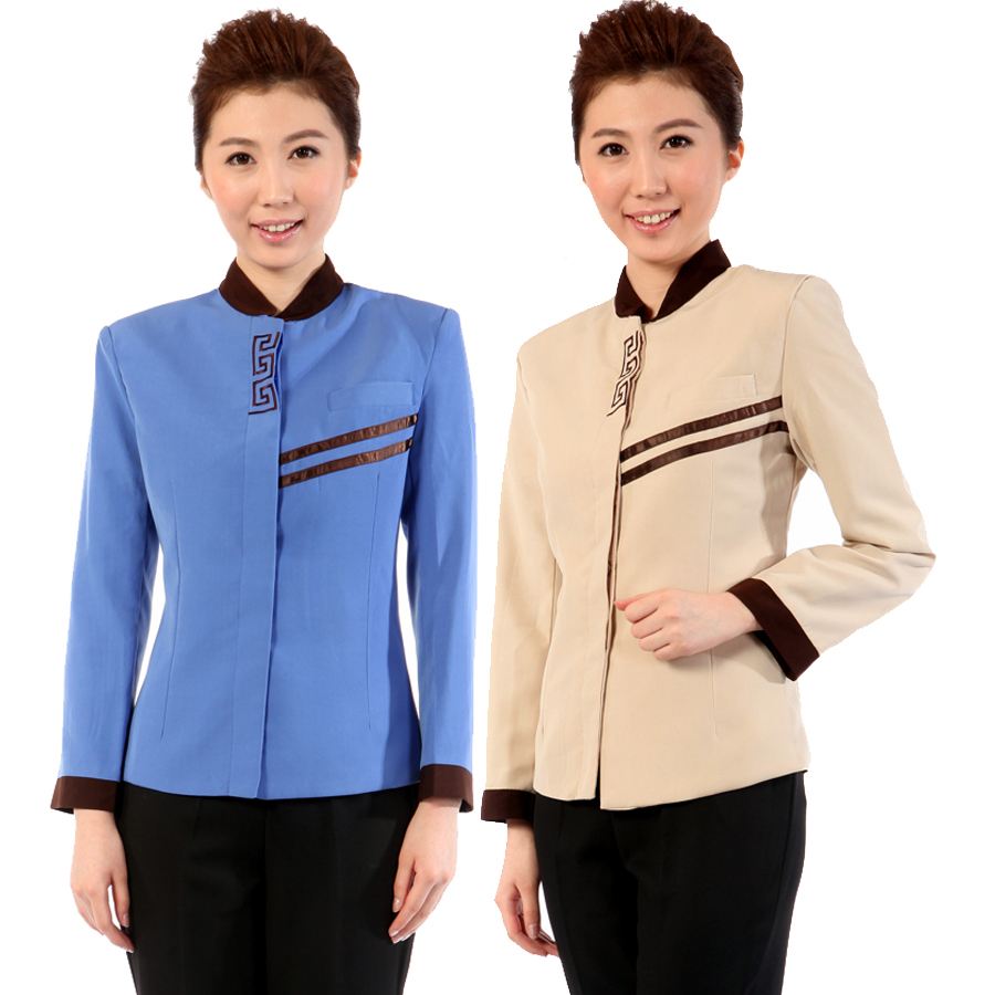 工作服只許員工上崗時穿戴,下班后必須更換。其配備和洗送要求是:員工工作服配2-3套,以后每年至少制裝一套。西服外套每周換洗1次,裙子每3-4天換洗1次,襯衫每1-2天換洗1次。而且員工不許穿已陳舊、破損的工作服上崗。