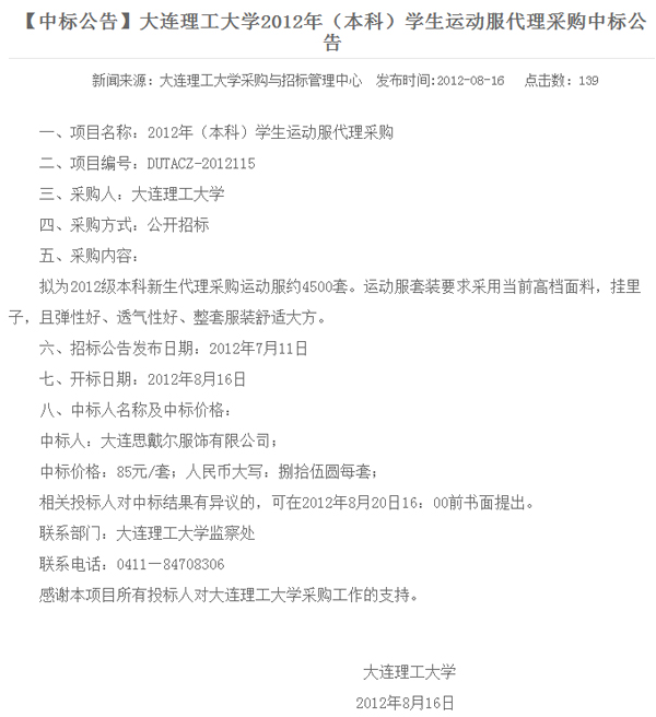 > 思戴爾中標(biāo)大連理工大學(xué)2012學(xué)生運(yùn)動(dòng)服采購(gòu)項(xiàng)目