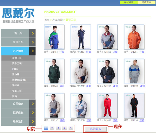 以前,打開產品相冊頁面,每個類別的產品分頁顯示,需要點擊頁面下方的頁面進行頁面切換,由于用戶瀏覽習慣的改變,這種方式已經不能給用戶提供足夠的便捷性了。因此思戴爾改進了產品的瀏覽方式,取消了分頁的頁面,添加了一個“顯示更多”按鈕。點擊這個按鈕,就可以在同一個頁面顯示更多的產品。任何一個類別的所有產品,都可以顯示在同一頁面上,極大的方便了用戶。具體請參考下圖: