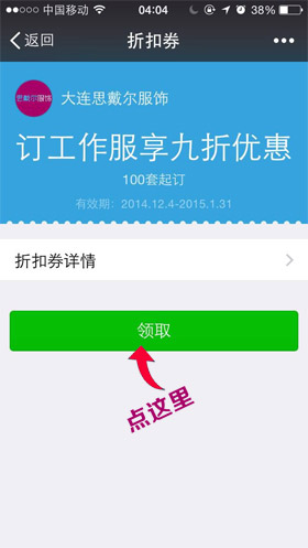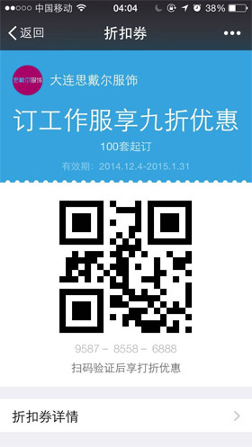 即日起至2015年3月31日,領取微信折扣券,訂購工作服即可享受9折優惠。